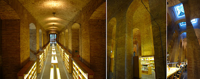 Pompeo Fabra University Library. An old reservoir, renovated into a library. There is a large body of water above (no public access, we tried hard...) but the upside down mirror-pyramids over the skylights wash down a blue reflection of light.