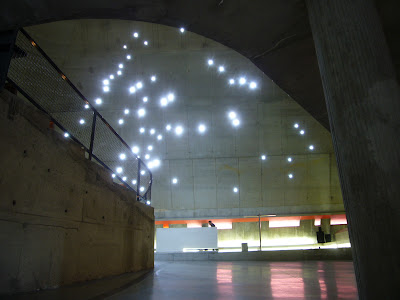 the curve of the mezzanine seems to correspond to the stippled light pattern, drawing you into...