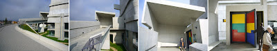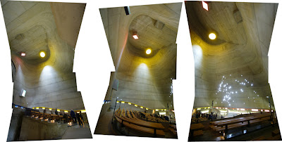 Eglise St. Pierre, Corbusier. hot off the press, concrete barely cured. The only building where it would have been actually nice if it rained: long vertical scupper drops water onto horiz band wrapping building, then down another vertical scupper. Our tour guide unfortunately took us backwards, through the understory (now a Corbu museum), then up a side stair to the main chapel volume. The intended procession is up the grassy berm...