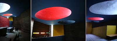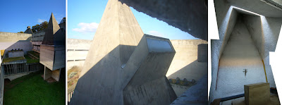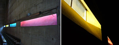 Corbu wasn't afraid to use color: selective surfaces to highlight and contrast against broad planes of concrete. Imagining the surfaces without the bold primary tones one might argue the form itself would still be there and just as powerful, say compared to Meier's purely formalistic white spaces. I don't know. Being a little habitually colorphobic myself, I was quite impressed and this has hopefully loosen me up a bit. One of the friars pops a mean tune on his violiny.